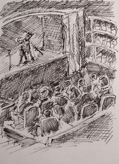 Die nächsten Skizzen zeigen eine desorientierte alte Frau, fern jeder Realität, eine, die ein Straßenlicht mit einem Scheinwerfer verwechselt, die einen Gehsteig zu ihrer Bühne erklärt. Um ihre gesamte Erscheinung ein Schleier von Verlorenheit.